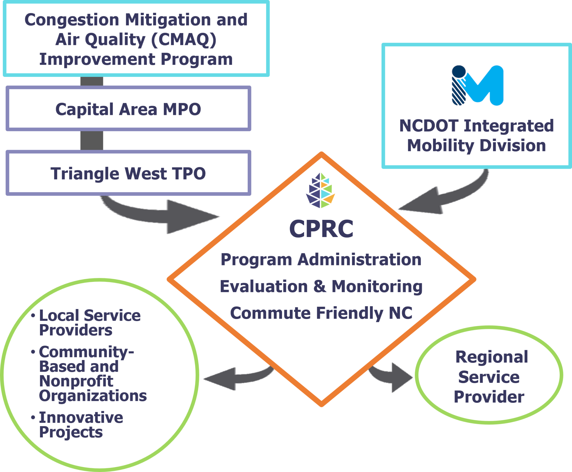 The Triangle Transportation Choices program collaborates with and receives funding from 3 different organizations. Two of the program’s funders are regional Metropolitan Planning Organizations (MPOs). These are the Capital Area Metropolitan Planning Organization (CAMPO) and the Triangle West Transportation Planning Organization (TWTPO). The third funder of the program is the North Carolina Department of Transportation- Integrated Mobility Division (NCDOT-IMD). The graphic on right hand side illustrates the funding and administrative structure of the program. A representative from each of these three funding organizations serves as a voting member in the program’s Oversight Committee (OC).